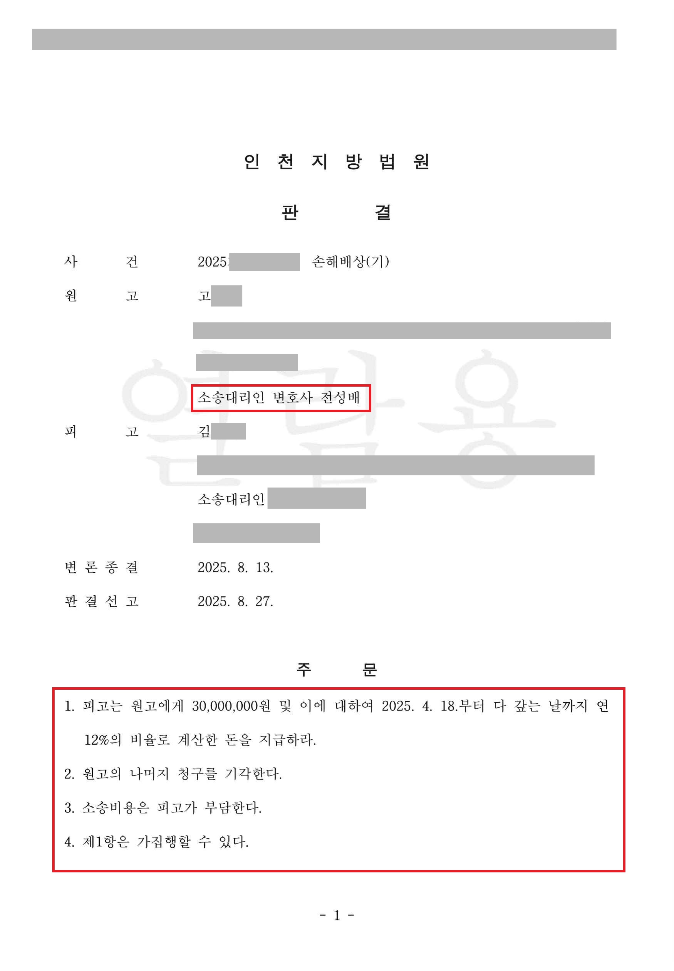 ¹ý¿øÀº Çǰí¿Í ¹è¿ìÀÚÀÇ ºÎÁ¤ÇàÀ§ ³»¿ë, ±â°£, ±×¸®°í ¿ø°íÀÇ È¥ÀÎ ±â°£°ú ÀÚ³à °ü°è µî Á¦¹Ý »çÁ¤À» Á¾ÇÕÀûÀ¸·Î °í·ÁÇÏ¿© 3,000¸¸ ¿øÀÇ À§ÀڷḦ »êÁ¤Çß½À´Ï´Ù. ¶ÇÇÑ, ¼Ò¼Ûºñ¿ë±îÁö ÇÇ°í°¡ ºÎ´ãÇÏ°Ô ÇÔÀ¸·Î½á ¿ø°íÀÇ °æÁ¦Àû ºÎ´ãÀ» ´ú¾îÁÖ¾ú½À´Ï´Ù.